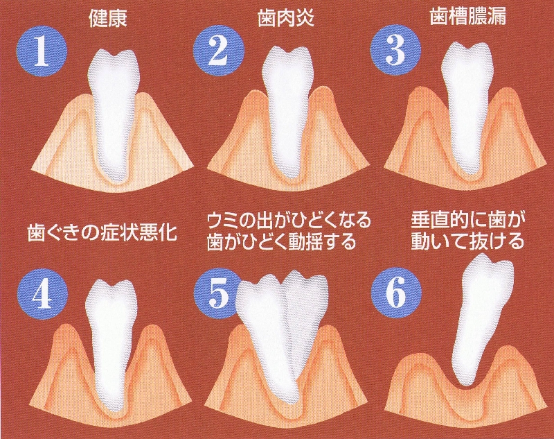 歯周病は早期発見!早期治療! 歯周病(歯槽膿漏)とは 歯を磨くと歯ぐきから血は出ませんか? 歯周病というのは、歯を支えている歯ぐきの病気のことです。●朝起きた時口の中が臭いと思いませんか?●歯ブラシを使うと歯ぐきから血が出ませんか?●歯ぐきの先端が赤く腫れていませんか?もし思い当たるようなら、歯ぐきの病気にかかっています。やがて...●冷たいもの、熱いものが歯にしみる。●歯がぐらぐらしてくる。●歯ぐきが盛り上がって歯にかぶさってくる。あるいは歯ぐきが退縮して歯の根が出てくる。●最後は歯が抜けてしまいます。 写真をクリックすると拡大表示されます。 サイトTOP 義歯